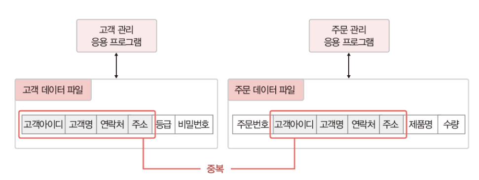 - 같은 내용의 데이터를 여러 파일에 중복으로 저장하여 공간이 낭비됨