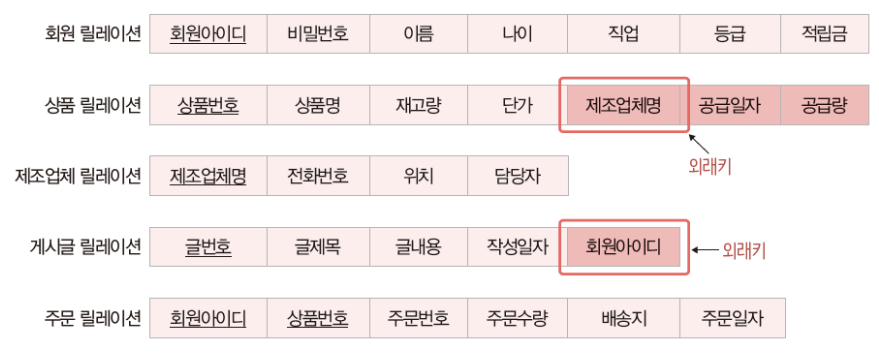 - 관계에 참여하는 개체 릴레이션들이 서로의 기본키를 주고 받아 외래키로 지정