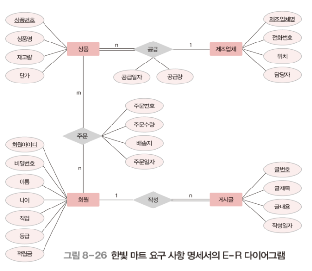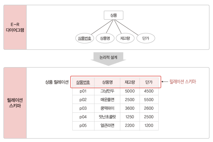 - 개념적 설계 단계의 결과물인 E-R 다이어그램을 릴레이션 스키마로 변환