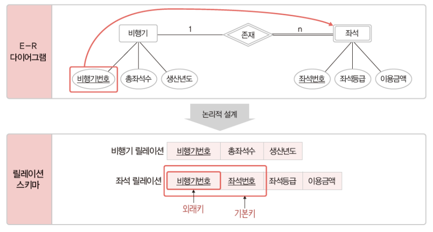 - E-R 다이어그램의 일대일 관계는 외래키로만 표현