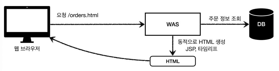 WAS에서 DB를 조회한 후 동적으로 HTML을 생성한다. HTML을 생성할 때는 JSP, 타임리프를 이용한 후 생성된 HTML을 웹 브라우저에게 제공한다.