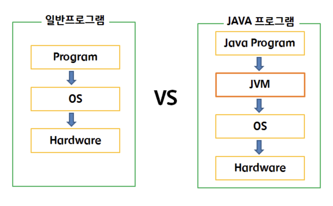 위 그림에서 볼 수 있듯이 일반 애플리케이션은 OS와 바로 맞붙어 있기 때문에 OS종속적이다. 그래서 다른 OS에서 실행시키기 위해서는 애플리케이션을 그 OS에 맞게 변경해야한다. 반면에 Java 애플리케이션은 JVM하고만 상호작용을 하기 때문에 OS와 하드웨어에 독립적으로 다른 OS에서도 프로그램의 변경없이 실행이 가능한 것이다. 단, JVM은 OS에 종속적이기 때문에 해당 OS에서 실행가능한 JVM이 필요하다.
