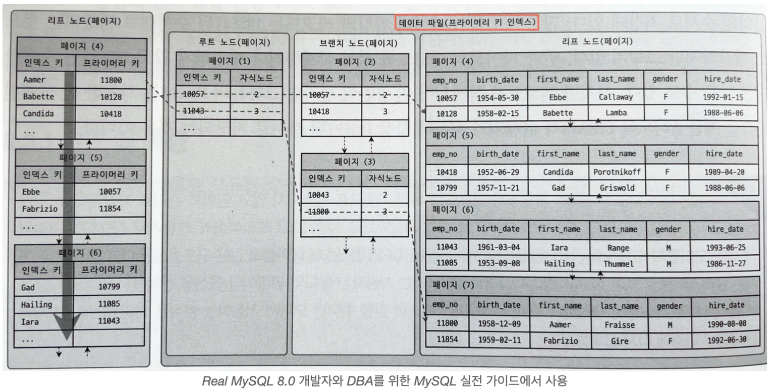 - 두 번째 그림은 InnoDB 테이블의 인덱스의 데이터 파일의 관계를 보여주는데, InnoDB 스토리지 엔진을 사용하는 테이블에서는 프라이머리 키가 ROWID의 역할을 한다.