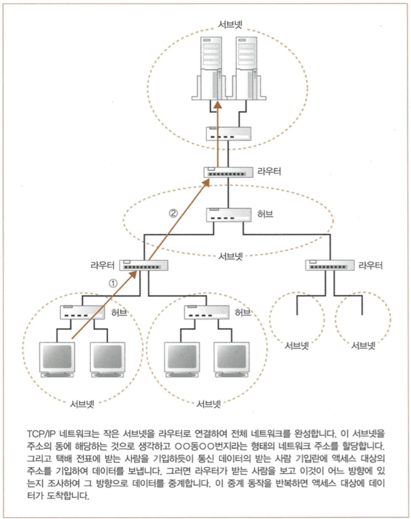 - TCP/IP는 아래 그림과 같이 서브넷이라는 작은 네트워크를 라우터로 접속하여 전체 네트워크가 만들어진다.