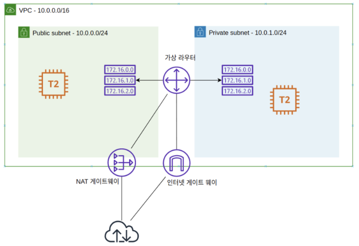 - 위 그림과 같이 10.0.0.0/16 대역의 VPC를 생성하면, 자동으로 가상 라우터가 생성된다.
