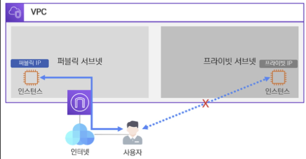 위 그림과 같이 퍼블릭 서브넷은 퍼블릭 IP를 가지고 인터넷 게이트웨이를 통해 외부 인터넷 구간의 사용자와 통신이 가능하나, 프라이빗 서브넷은 프라이빗 IP 만 가지고 있어 자체적으로 외부 인터넷 구간의 사용자와 통신이 불가능하다.