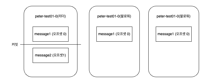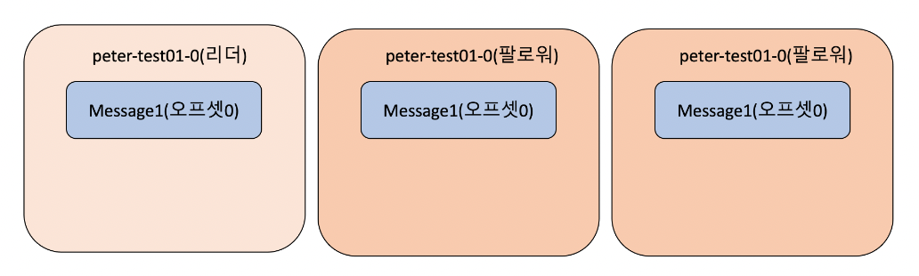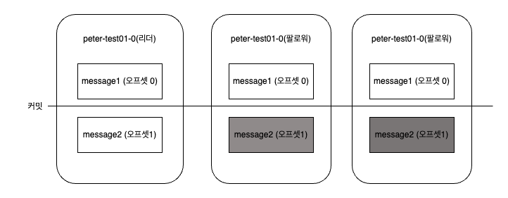 → 위 그림은 peter-test01 토픽이 1개의 파티션과 3개의 리플리케이션 팩터를 갖고 있다. 또한 현재는 리더만이 0번 오프셋에 Message1이라는 메시지를 갖고 있는 상태이다. 나머지 팔로워들은 아직 리더에게 저장된 메시지를 리플리케이션 하기 전이다.