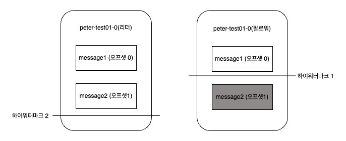 - 팔로워는 1번 오프셋인 message2 메시지까지 리플리케이션을 완료했지만, 아직 리더로부터 하이워터마크를 2로 올리는 내용은 전달받지 못한 상태이다