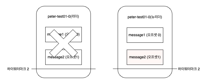 - 리더와 팔로워 간의 리플리케이션이 있음에도 불구하고, 리더가 변경되는 과정을 통해 최종적으로 1번 오프셋의 Message2 메시지가 손실된 것이다.