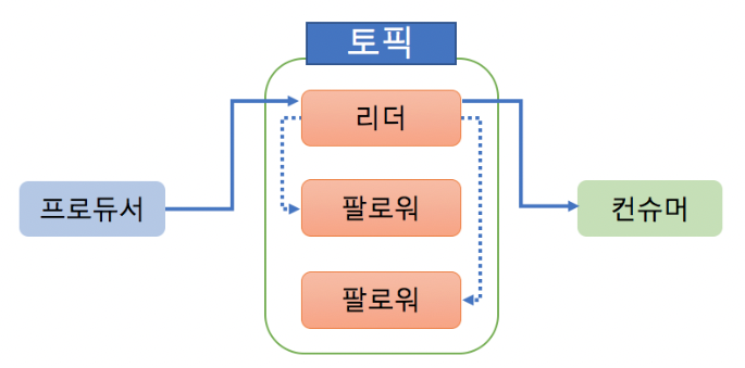 - 카프카는 내부적으로 모두 동일한 리플리케이션들을 리더와 팔로워로 구분하고, 각자의 역할을 분담시킨다.