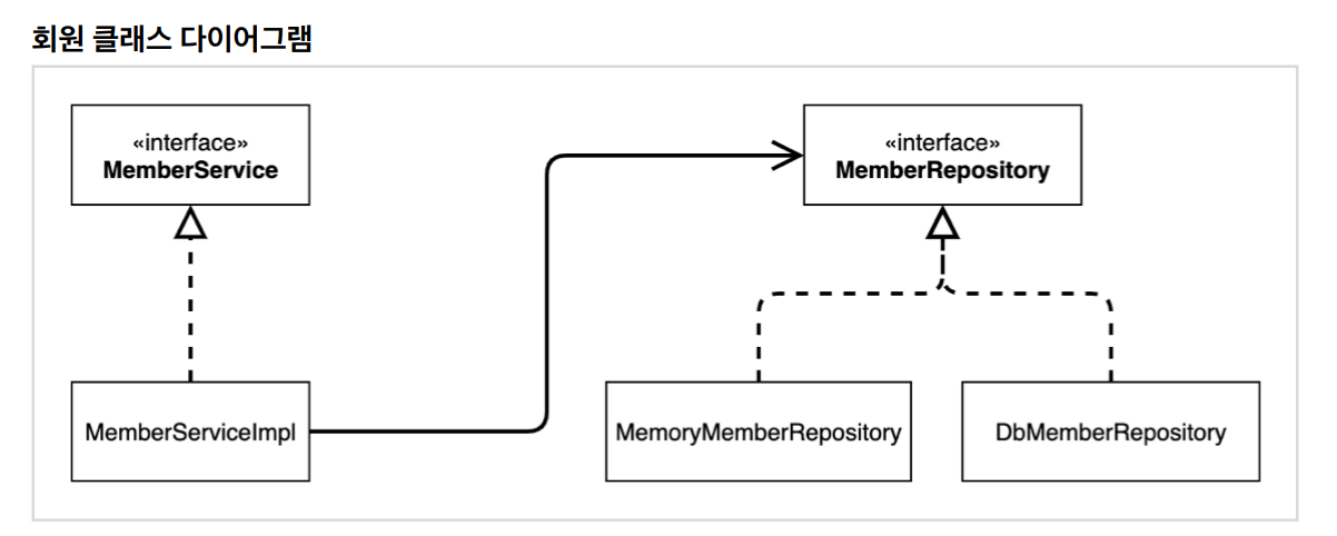 회원 도메인 개발은 위 그림에 맞춰 역할과 구현을 나눠 개발할 것이다. 가장 첫 번째로, 회원 도메인을 개발할 것이므로 member라는 패키지를 생성해주자 그리고 그 안에 회원의 등급을 나눠줄 enum을 생성해준다 라는 이름으로 생성하였다. package spring.core.member; public enum Grade { BASIC, VIP } 그리고 회원 정보와 관련된 Member라는 클래스를 하나 생성해주고 그 안에는 id와 name, grade 정보를 선언해준다. 기본적으로 선언한 3개 파라미터에 대한 생성자와 getter/setter를 만들어준다 (윈도우의 경우 단축키 Alt + insert) package spring.core.member; public class Member..