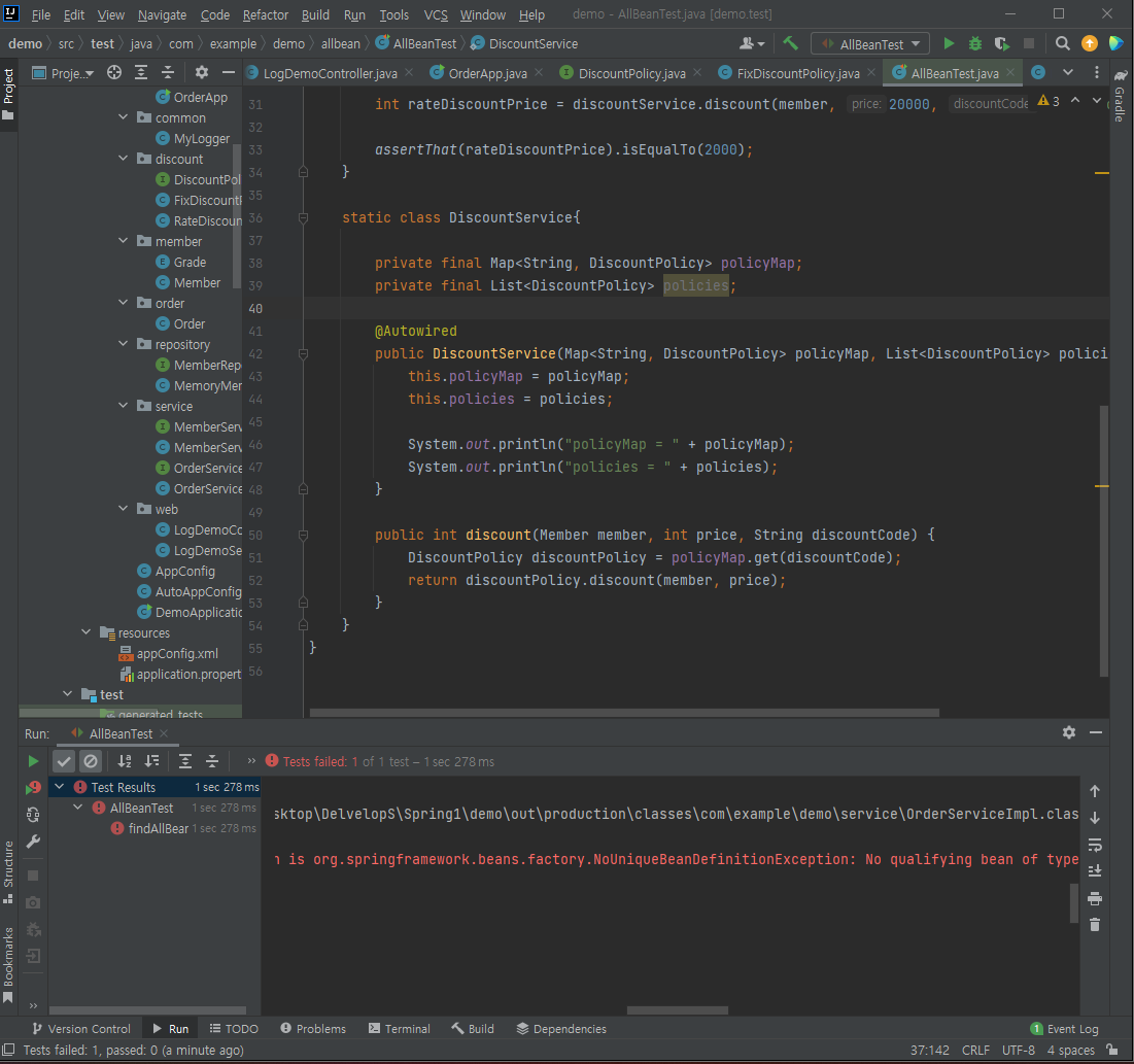 @Autowired는 타입(Type)으로 조회한다. @Autowired private DiscountPolicy discountpolicy; 타입으로 조회하기 때문에, 마치 다음 코드와 유사하게 동작한다. ac.getBean(DiscountPolicy.class) 스프링 빈 조회에서 배웠듯이 타입으로 조회하면 선택된 빈이 2개 이상일 때 문제가 발생한다. (조회했을 때 존재하지 않는 타입이면 그 때도 문제 발생, 이를 피하기 위해서 "required = false"를 넣어주어야 한다.) DiscountPolicy의 하위 타입인 FixDiscountPolicy, RateDiscountPolicy 둘다 스프링 빈으로 선언해보자. @Component public class FixDiscountPolicy im..