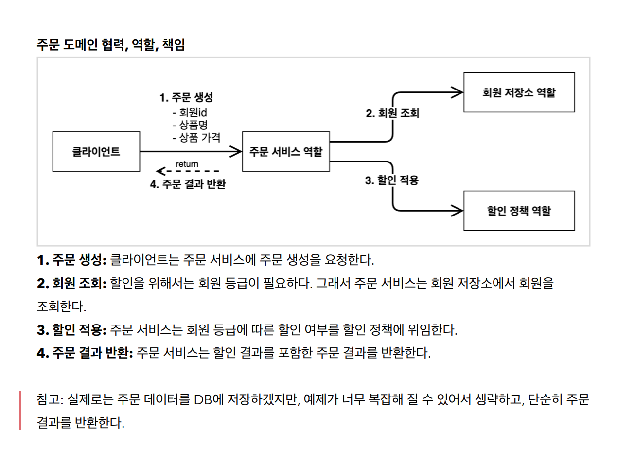주문과 할인 정책 ▶ 회원은 상품을 주문할 수 있다. ▶ 회원 등급에 따라 할인 정책을 적용할 수 있다. ▶ 할인 정책은 모든 VIP는 1000원을 할인해주는 고정 금액 할인을 적용해달라. (나중에 변경 될 수 있다.) ▶ 할인 정책은 변경 가능성이 높다. 회사의 기본 할인 정책을 아직 정하지 못했고, 오픈 직전까지 고민을 미루고 싶다. 최악의 경우 할인을 적용하지 않을 수 도 있다. (미확정) 할인 정책에 대한 인터페이스 package spring.core.discount; import spring.core.member.Member; public interface DiscountPolicy { /* @return 할인 대상 금액 */ int discount(Member member, int price)..