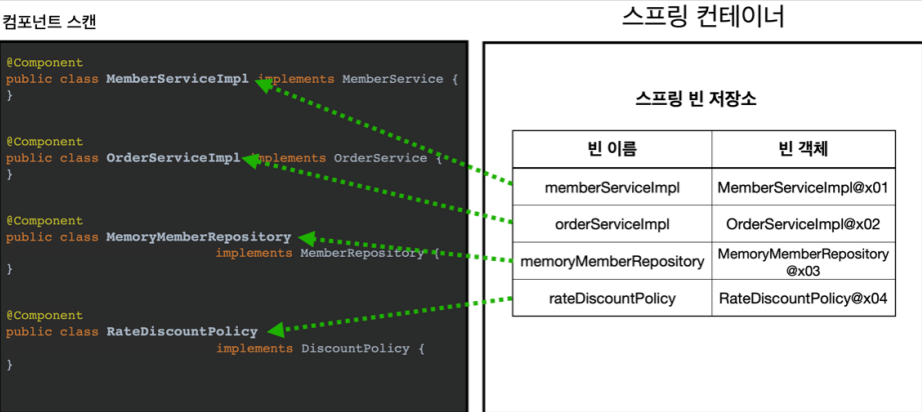 지금까지는 스프링 컨테이너를 생성할 때 설정할 때 설정 클래스에 @Configuration을 선언하고 그 안에 매서드를 통해 우리가 필요한 클래스들을 @Bean으로 스프링에 등록하였다. 하지만 이렇게 @Bean으로 설정하게 되는 경우 등록해야할 스프링 빈이 수십, 수백개가 되면 일일이 등록하기도 힘들고, 누락하는 문제가 발생할 수도 있다. 그래서 스프링은 설정 정보가 없어도 자동으로 스프링 빈을 등록하는 컴포넌트 스캔이라는 기능을 제공한다. 또 의존관계도 자동으로 주입하는 @Autowired라는 기능도 제공한다. package com.example.demo; import org.springframework.context.annotation.ComponentScan; import org.springfram..
