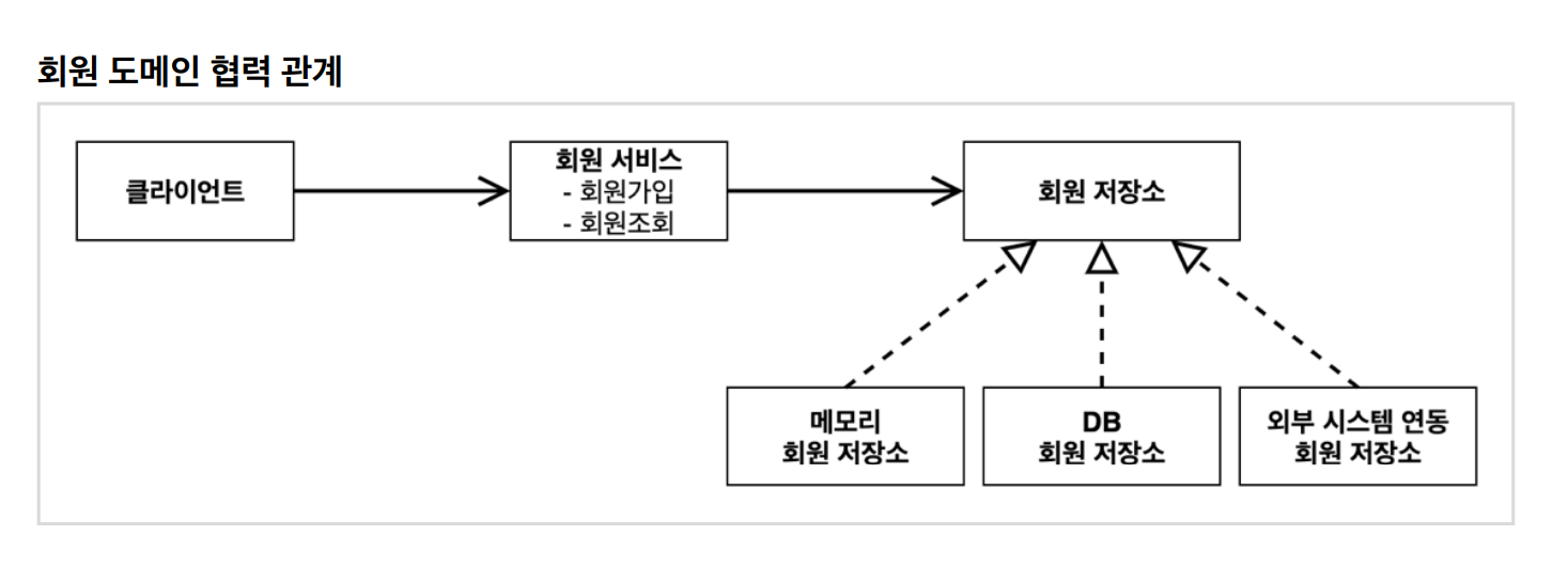 회원 ▶ 회원 회원을 가입하고 조회할 수 있다. ▶ 회원은 일반과 VIP 두 가지 등급이 있다. ▶ 회원 데이터는 자체 DB를 구축할 수 있고, 외부 시스템과 연동할 수 있다. (미확정) 주문과 할인 정책 ▶ 주문과 할인 정책 회원은 상품을 주문할 수 있다. ▶ 회원 등급에 따라 할인 정책을 적용할 수 있다. ▶ 할인 정책은 모든 VIP는 1000원을 할인해주는 고정 금액 할인을 적용해달라. (나중에 변경 될 수 있다.) ▶ 할인 정책은 변경 가능성이 높다. 회사의 기본 할인 정책을 아직 정하지 못했고, 오픈 직전까지 고민을 미루고 싶다. 최악의 경우 할인을 적용하지 않을 수 도 있다. (미확정) 회원 도메인 설계